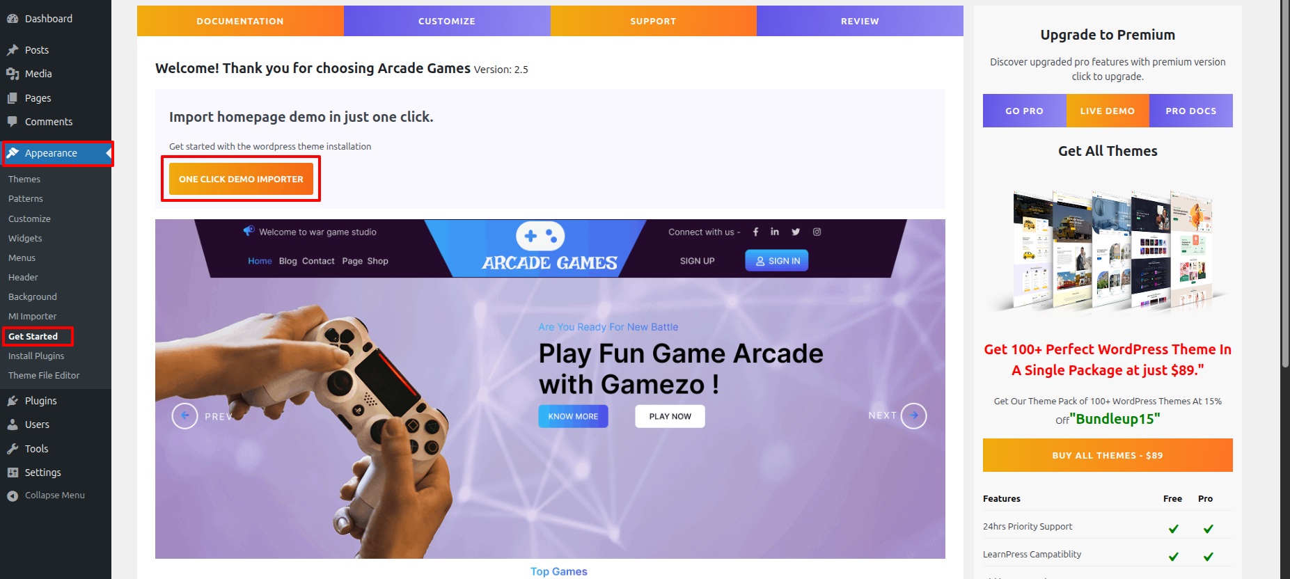 Once you are on the Get Started, click on the ONE CLICK DEMO IMPORTER button.