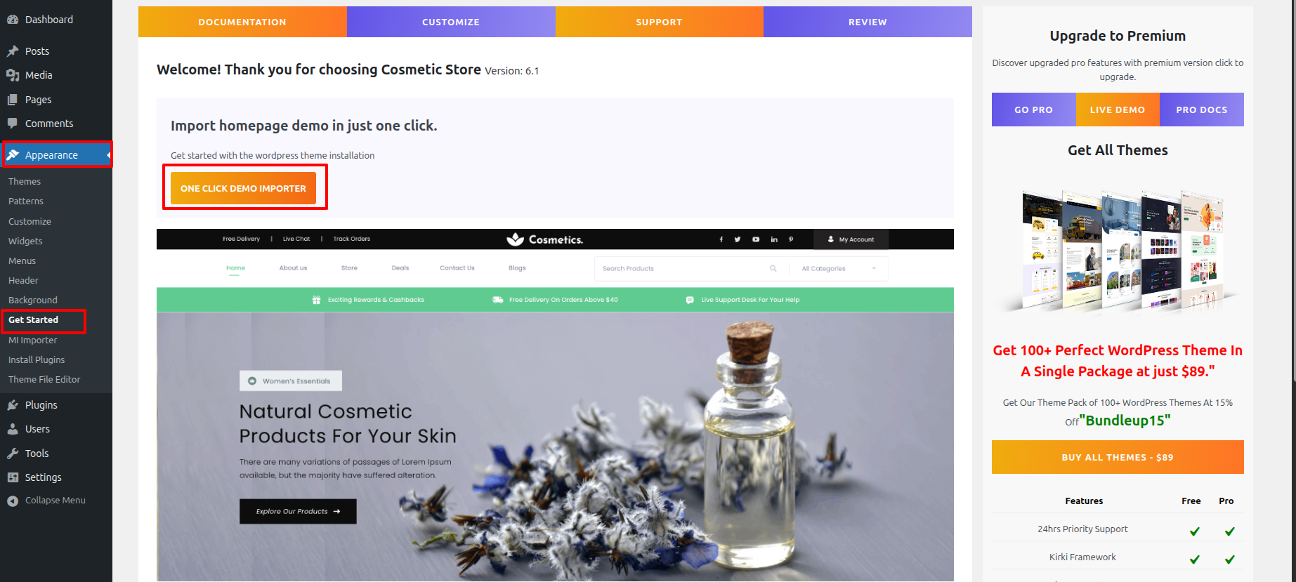 Once you are on the Get Started, click on the ONE CLICK DEMO IMPORTER button.