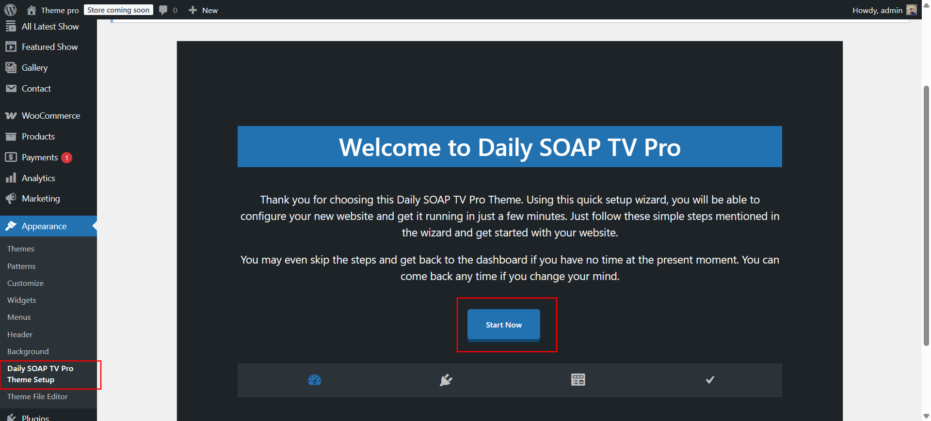 Once you are on the Daily SOAP TV Pro themes setup, click on the start button.