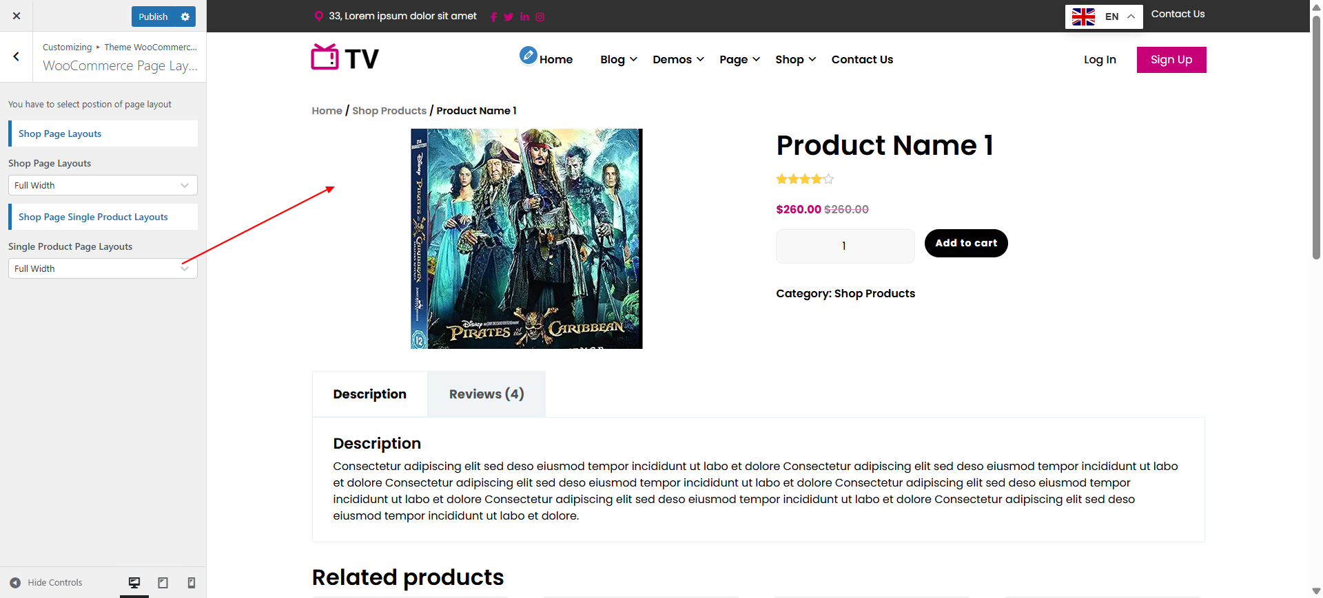 In the Dashboard, go to Appearance >> Customize >> Theme WooCommerce Settings >> WooCommerce Product