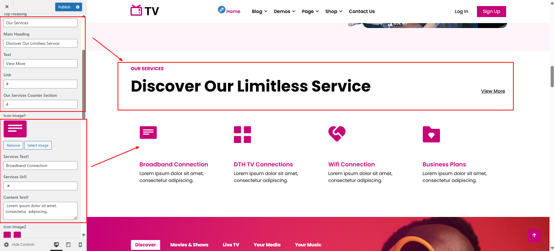 You can set heading and sub heading for section and content. And set image, text and url.