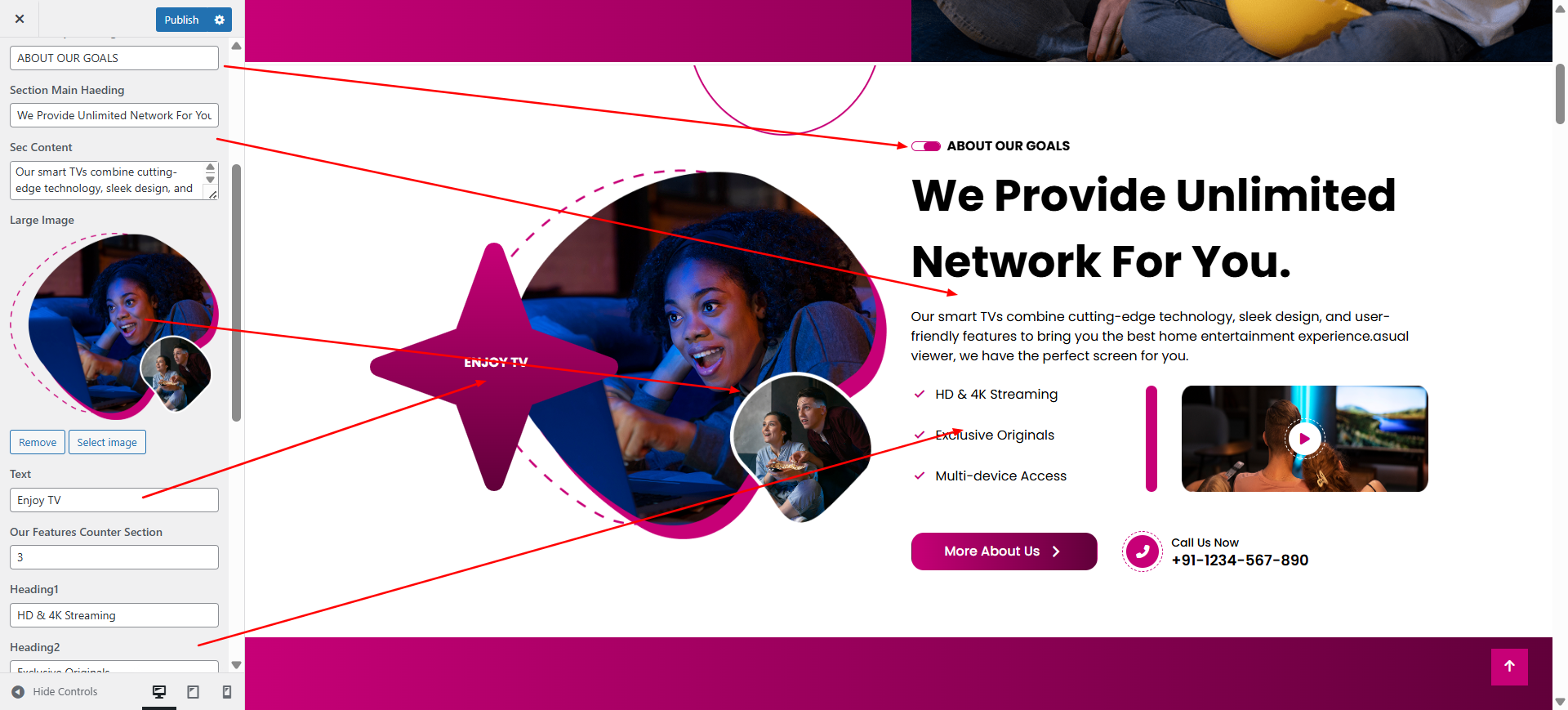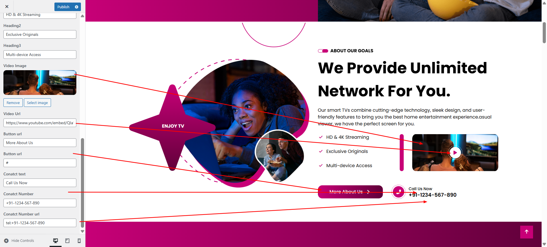 You can set main heading , content , button text and button url for section.