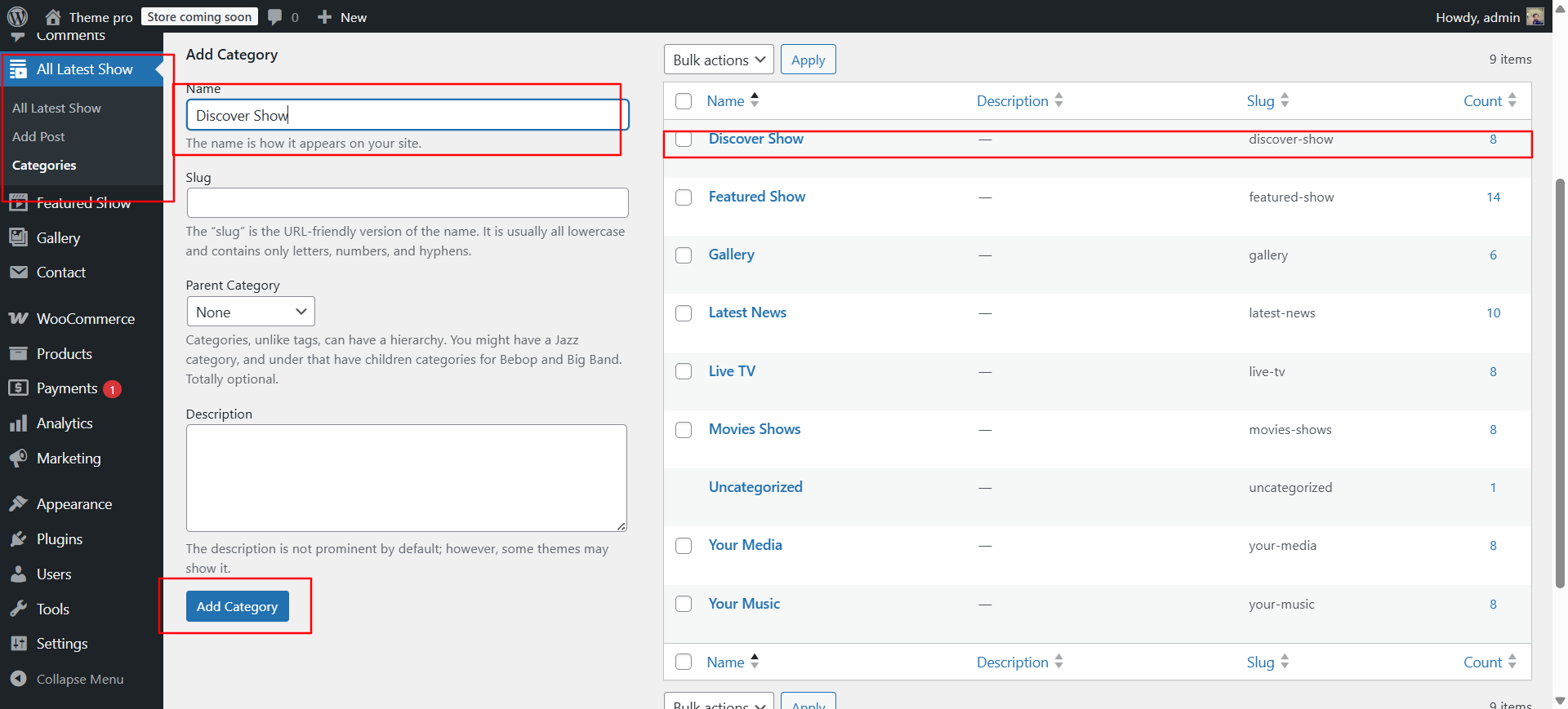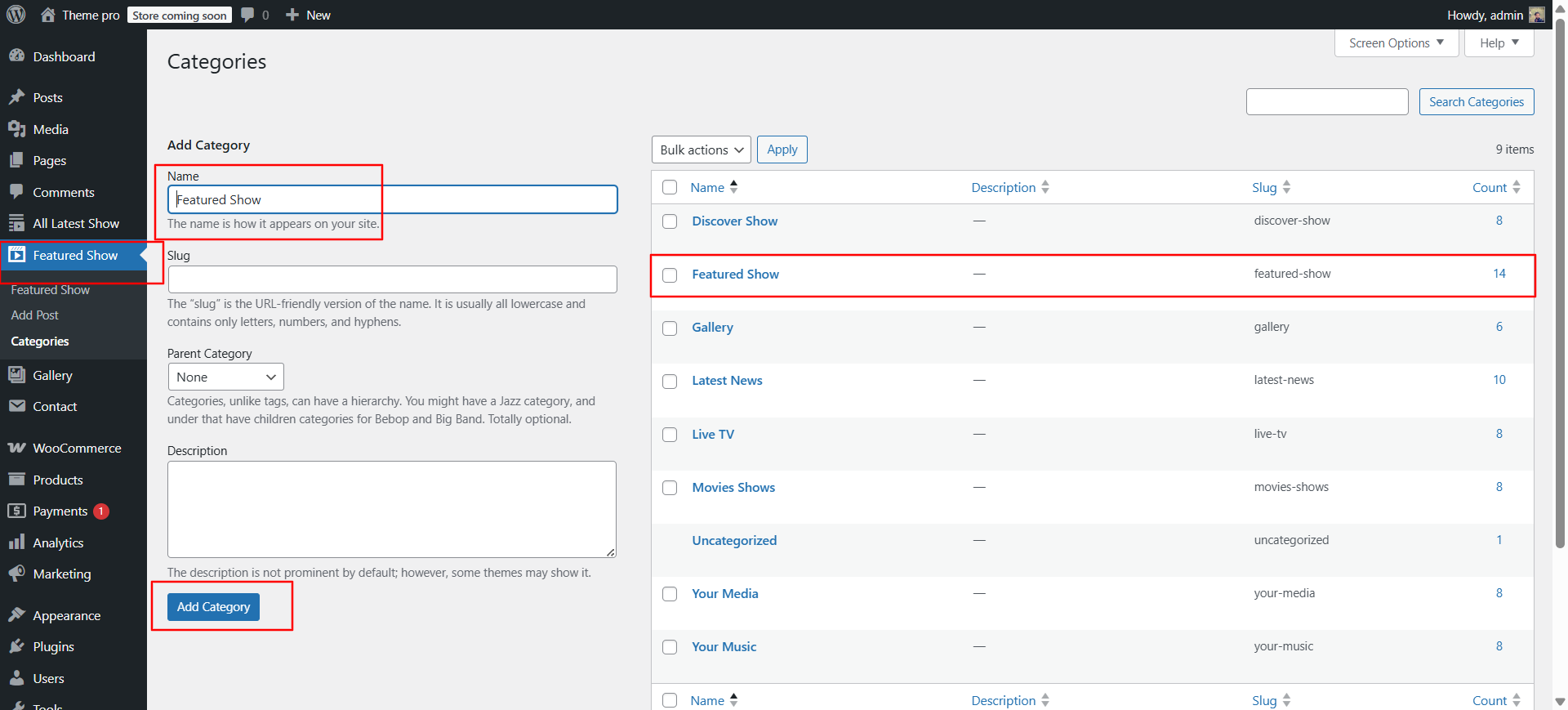 In the Dashboard, go to Products >> Categories >> Add New