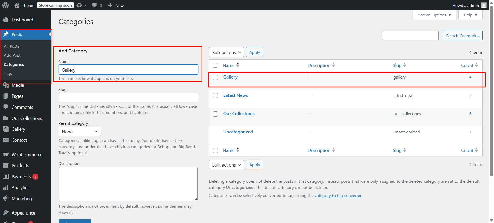 In the Dashboard, go to Posts >> Categories >> Add New