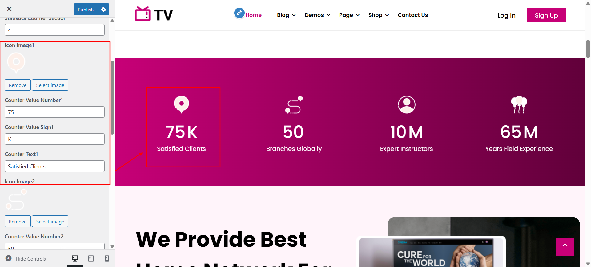 In the Dashboard, go to Appearance >> Customize >> Theme Options >> Counter Or Statistics Setings