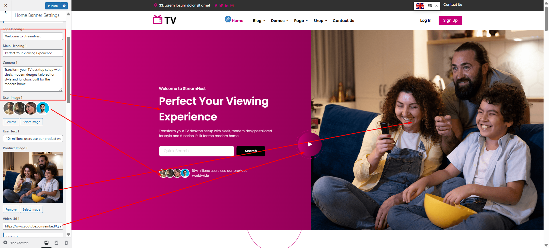 You can set heading, content, image, button text and button url. You can choose from this options for each banner option.