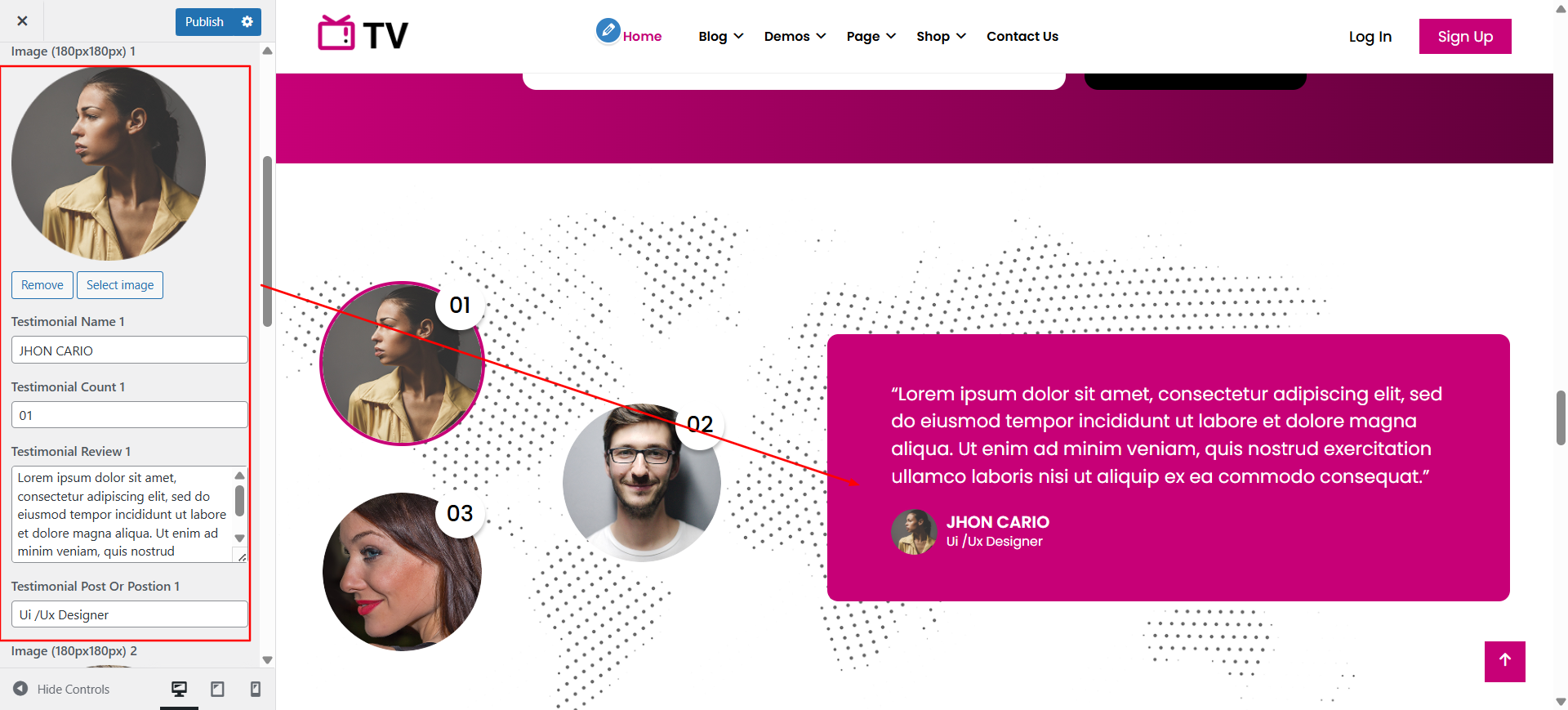 You can set heading and content of section. You can choose from this options for each Testimonial settings.