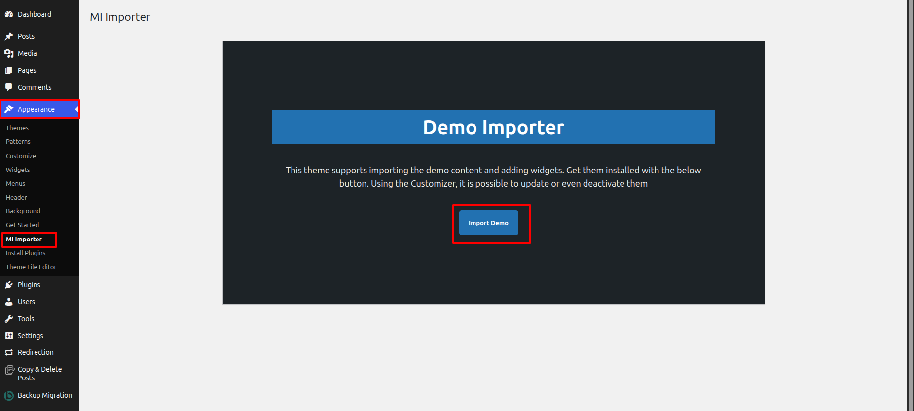 Once you are on the Get Started, click on the ONE CLICK DEMO IMPORTER button.