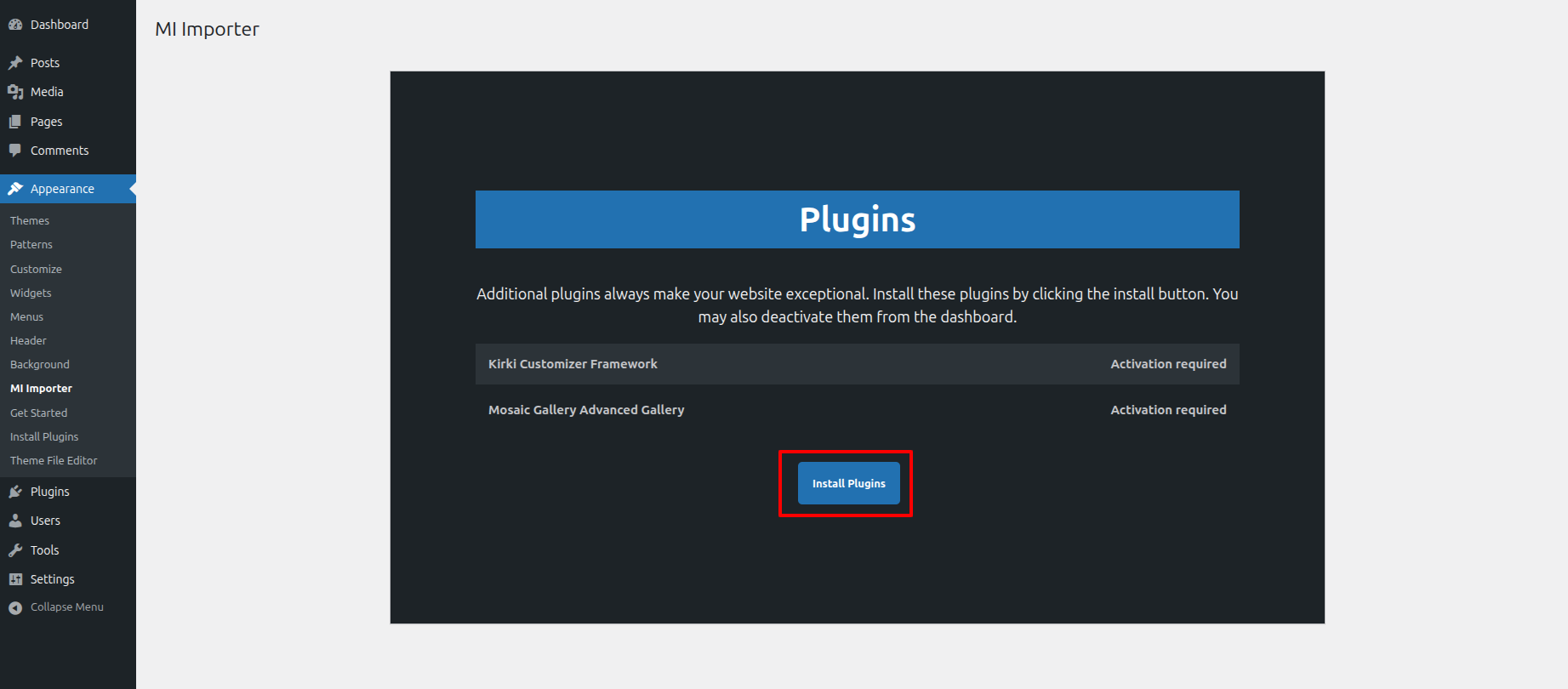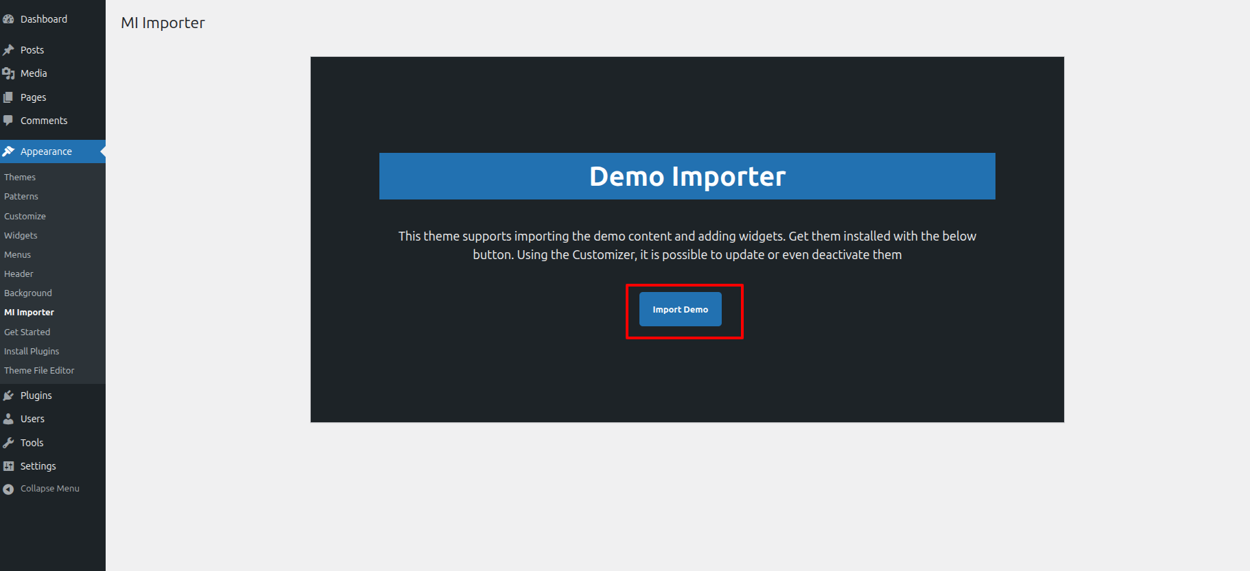 Once you are on the Get Started, click on the ONE CLICK DEMO IMPORTER button.