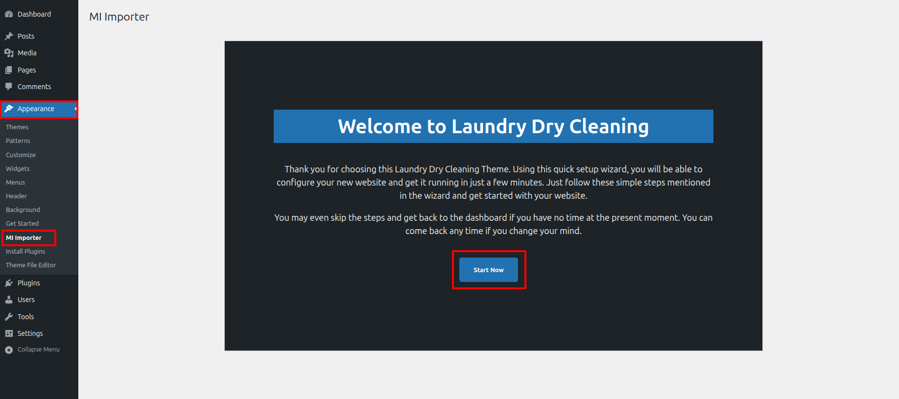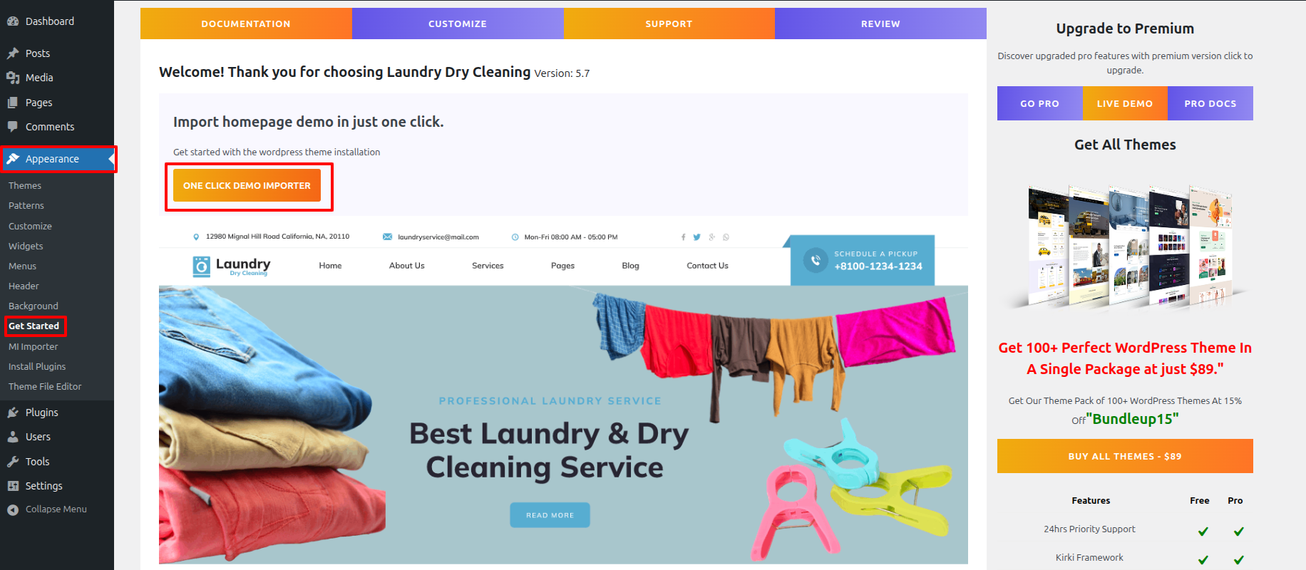 Once you are on the Get Started, click on the ONE CLICK DEMO IMPORTER button.
