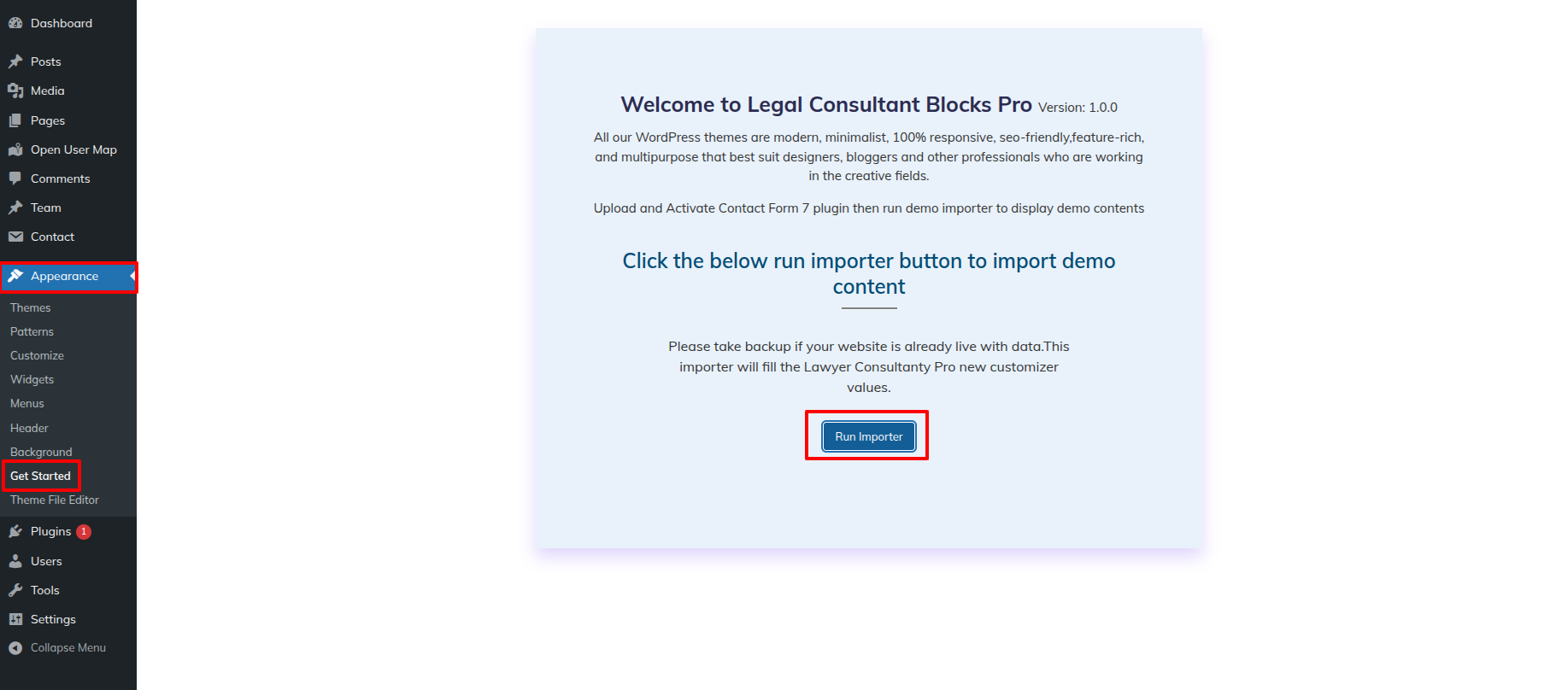 In the Dashboard, Move Forward to Appearance >> Legal Consultant Blocks Pro Themes Setup