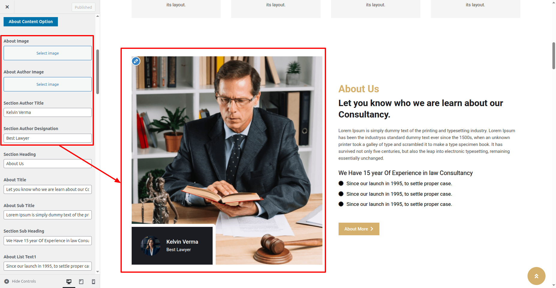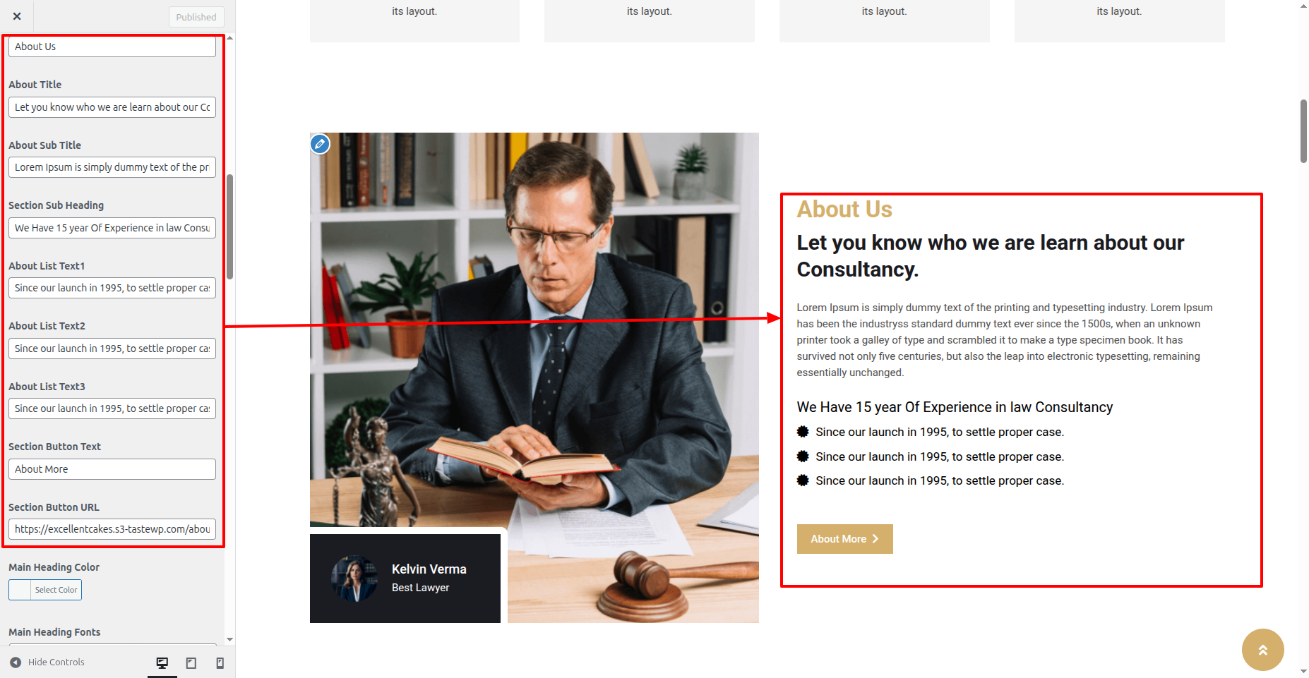 You could set heading and content for this section. You could set button text with button url link. You can choose from this options for each About Us settings.