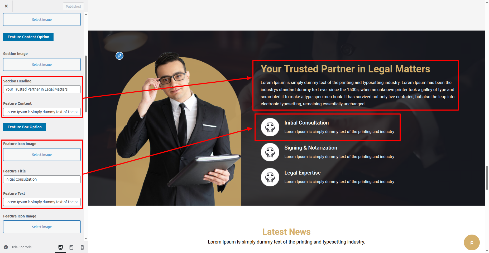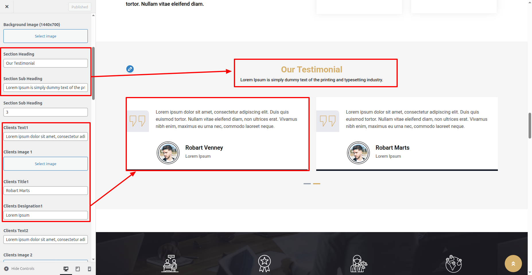 You could set heading and content of section. You could set icon also. You can choose from this options for each Featured settings.