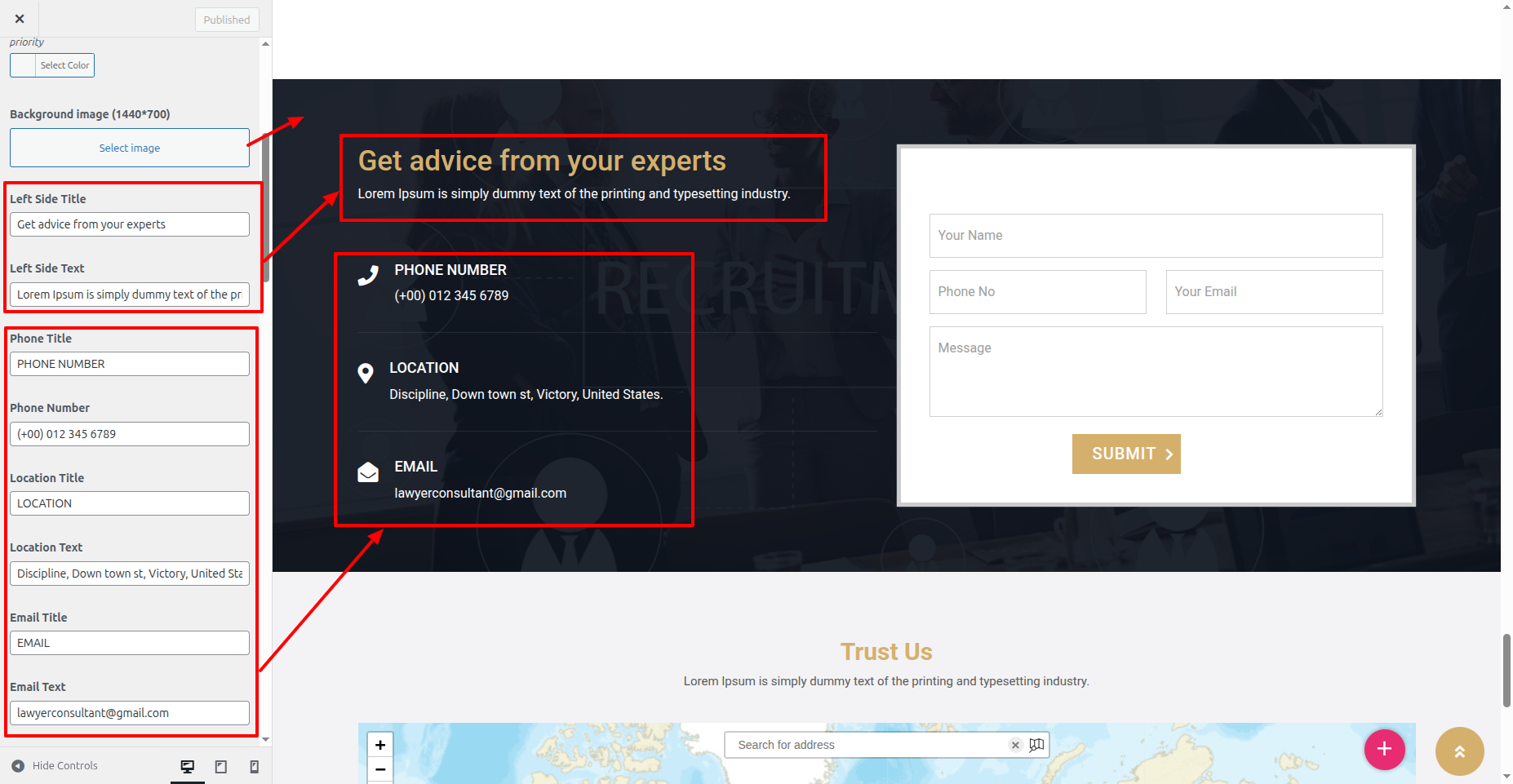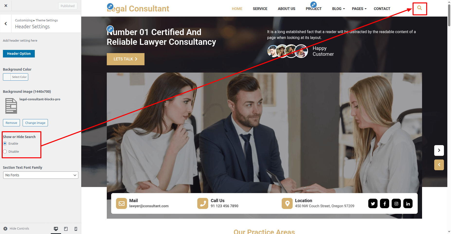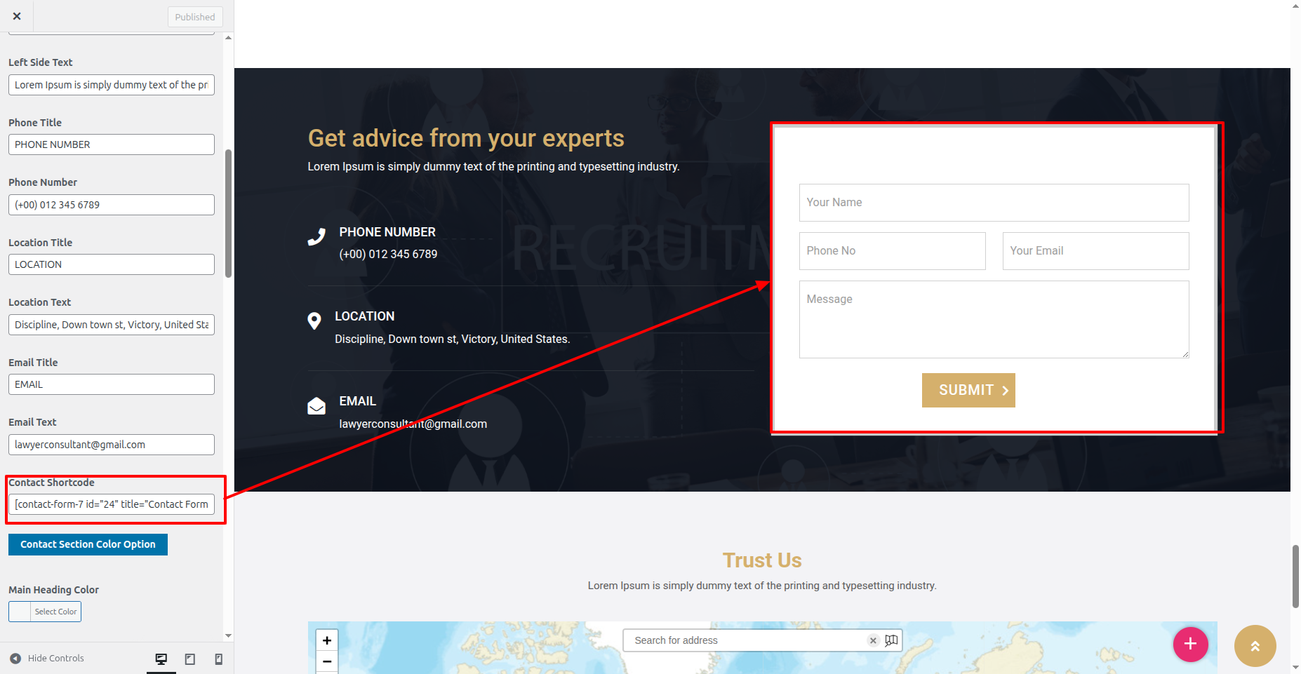 In the Dashboard, Move Forward to Appearance >> Select Customize >> Select the Theme Settings option >> Home Contact Settings