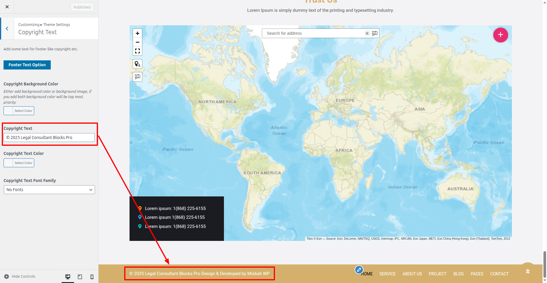 In the Dashboard, Move Forward to Appearance >> Select Customize >> Select the Theme Settings option >> Footer Copyright Settings