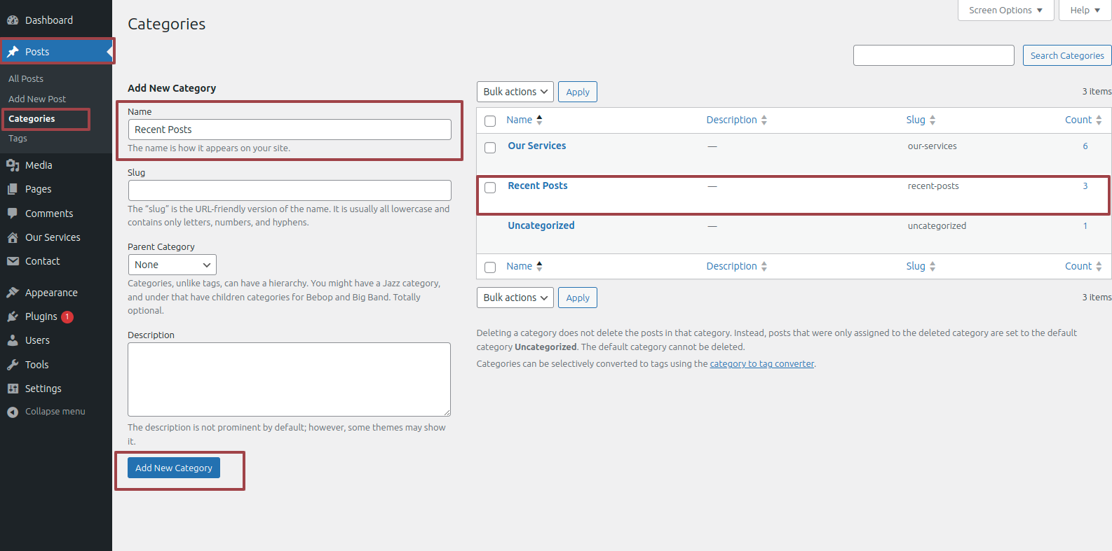 This screen is divided into the Add New Category and category table sections.