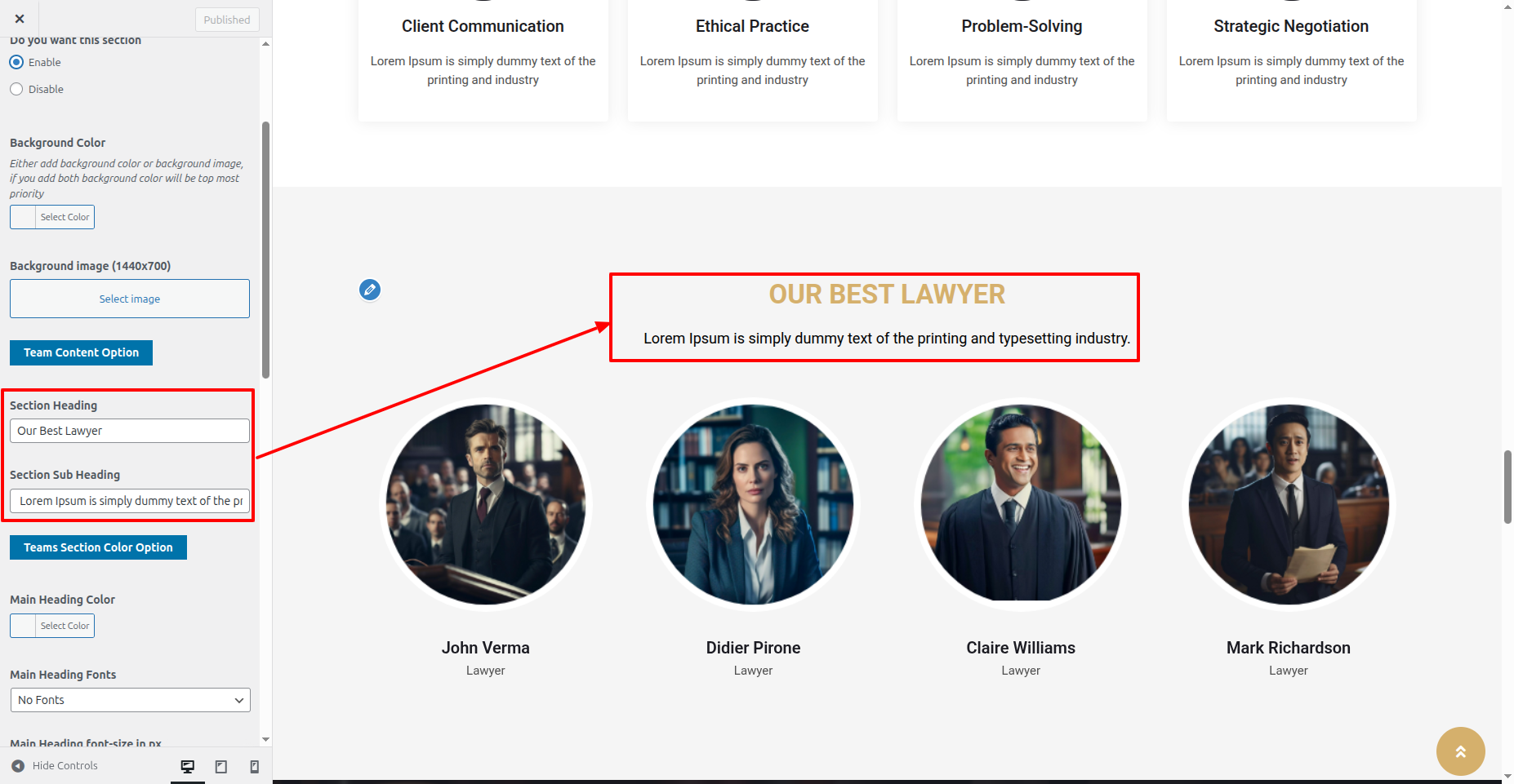 You could set the heading, content, and images for Team. You can also select review, name, and designation. You can choose from this options for each Team settings.