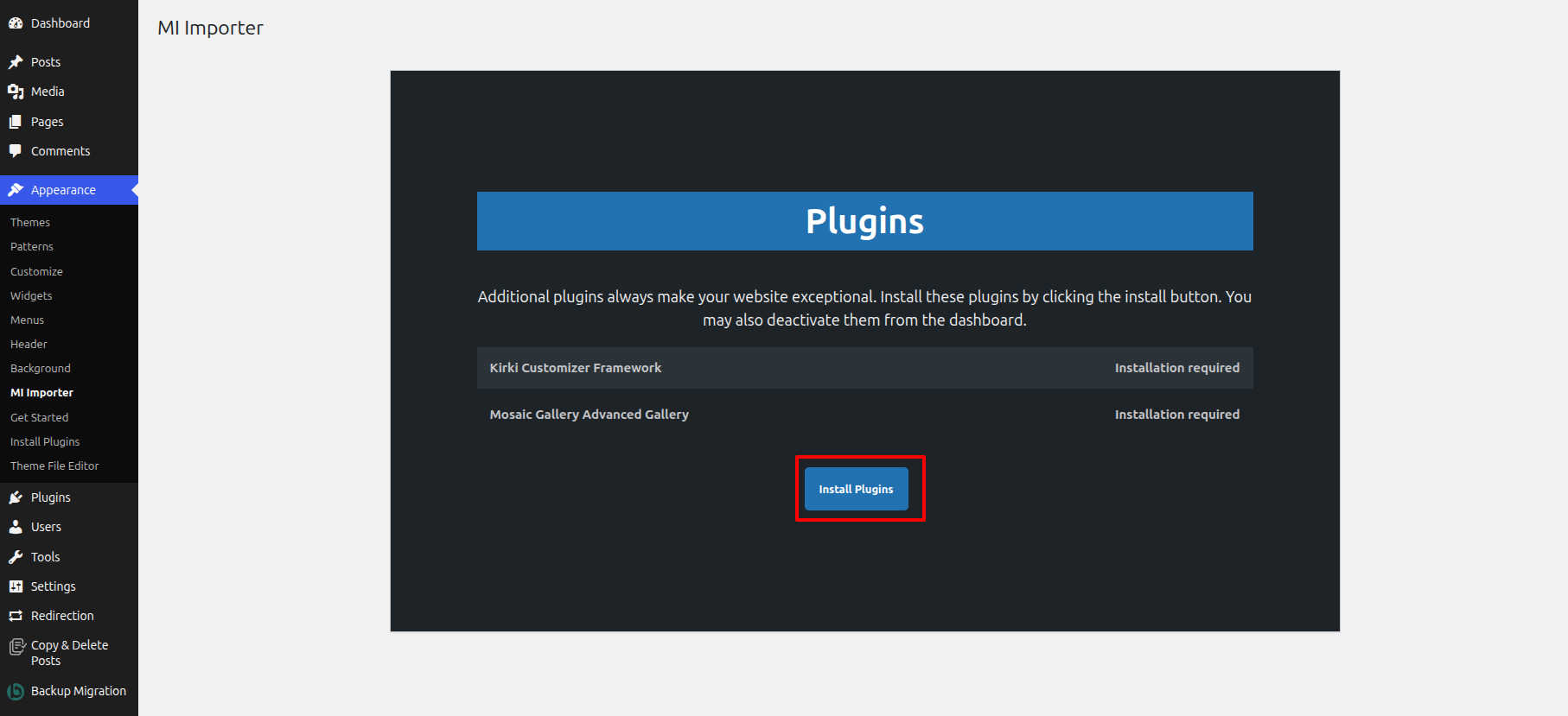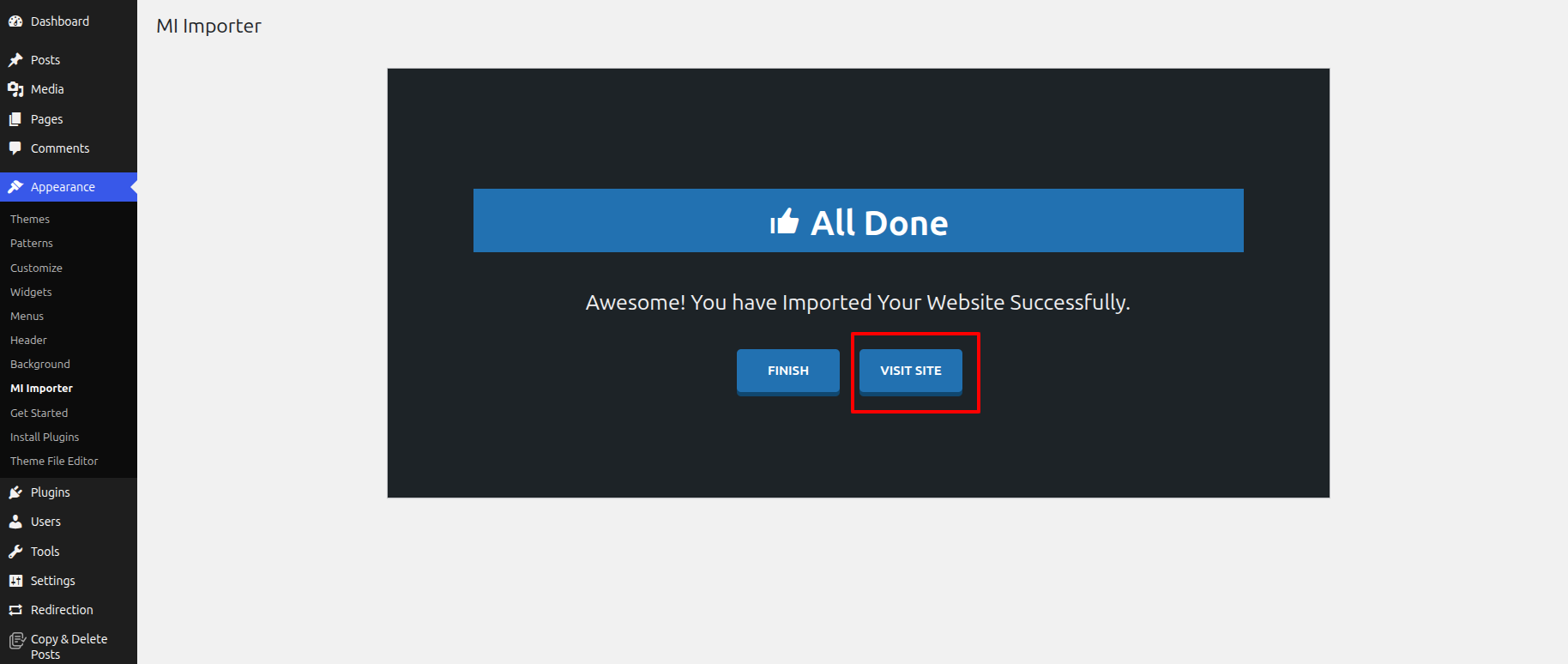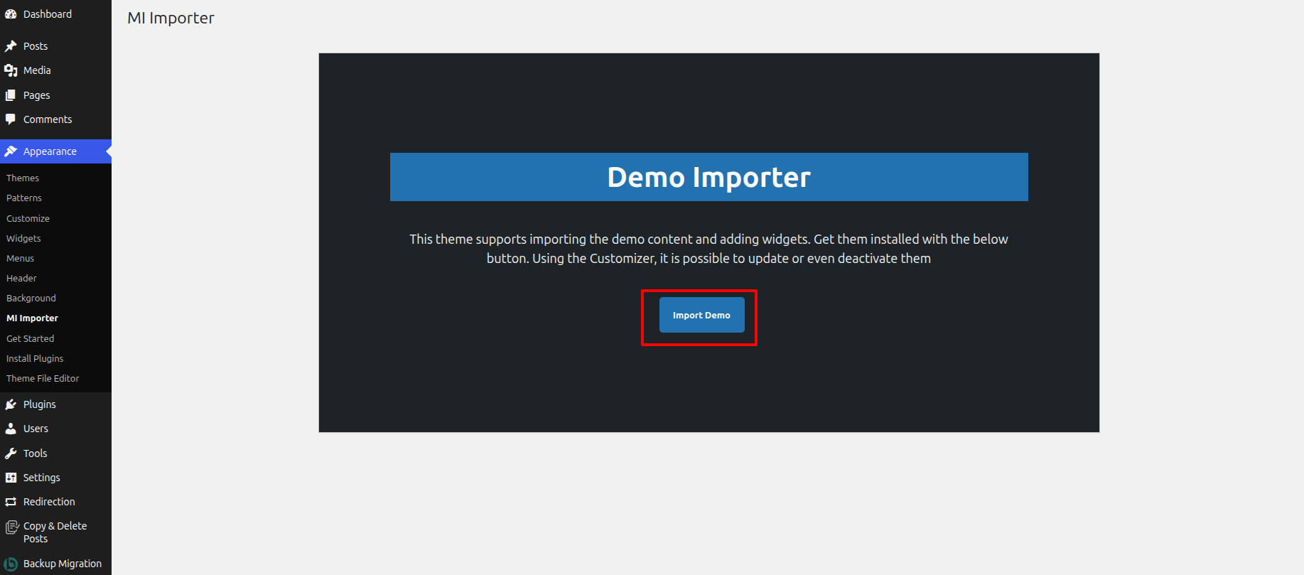 Once you are on the Get Started, click on the ONE CLICK DEMO IMPORTER button.
