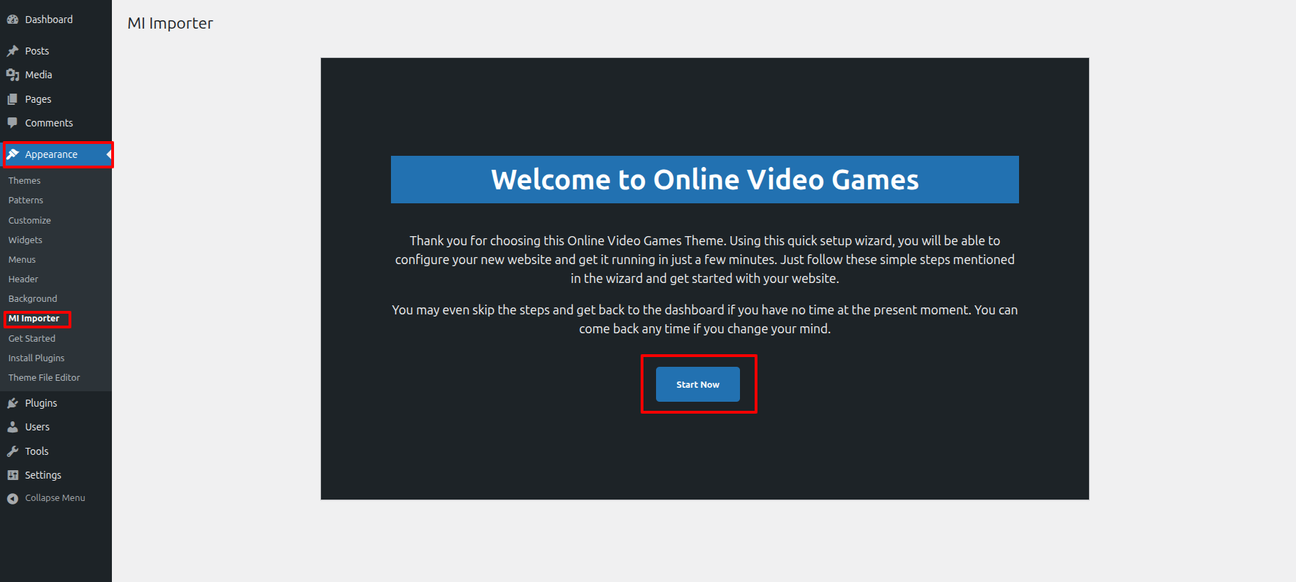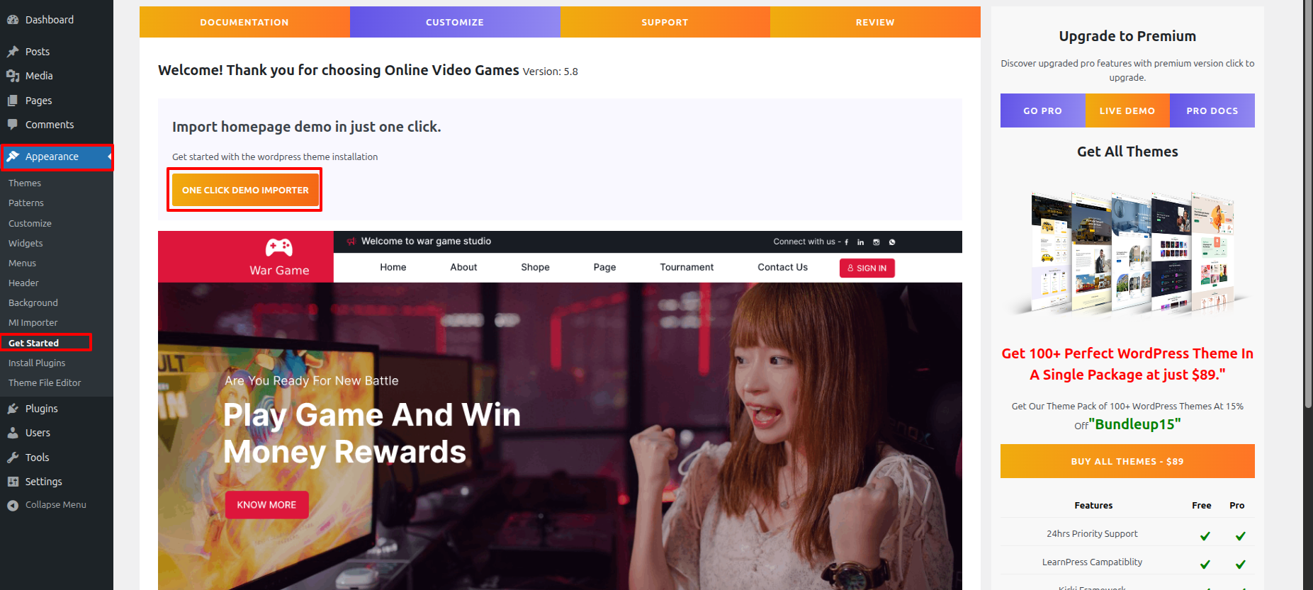 Once you are on the Get Started, click on the ONE CLICK DEMO IMPORTER button.