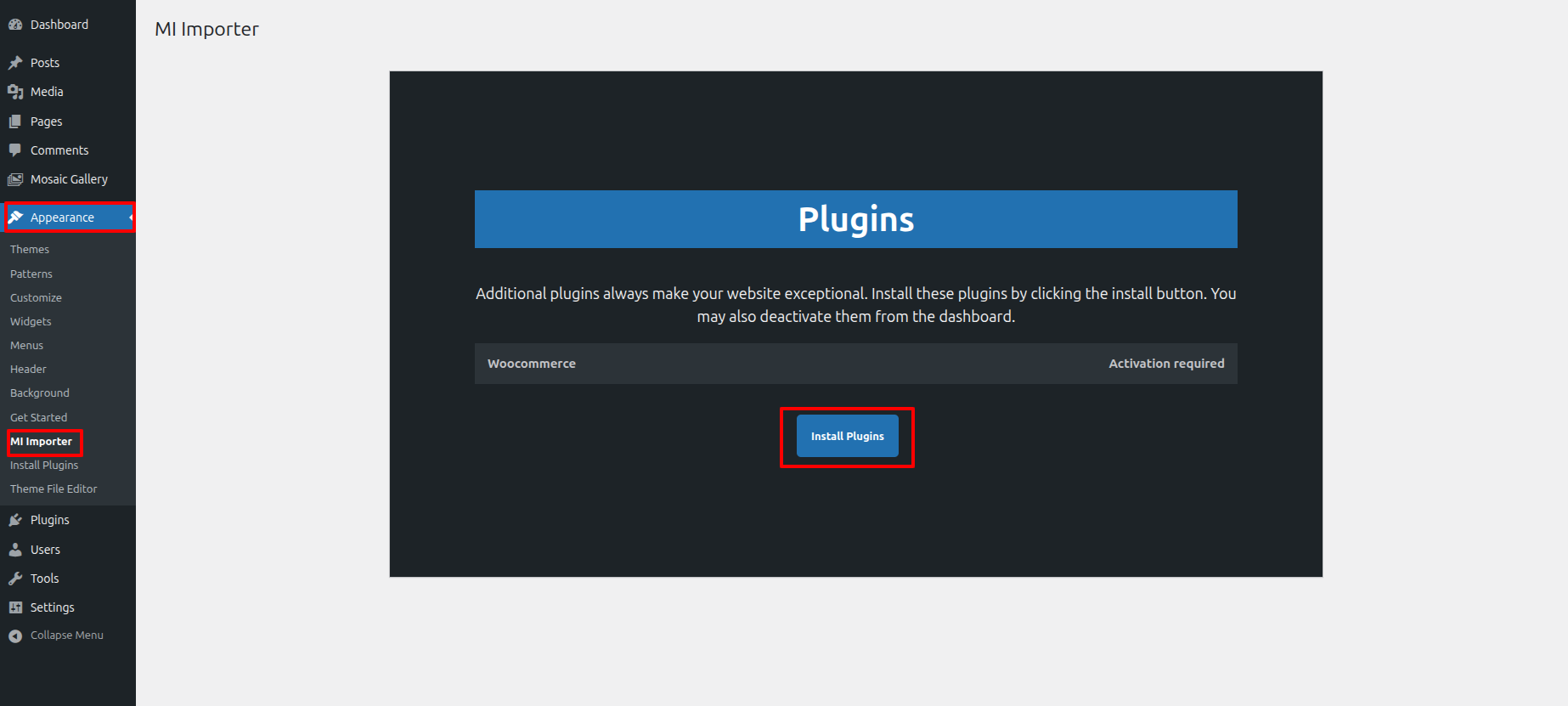 Once you are on the Get Started, click on the ONE CLICK DEMO IMPORTER button.