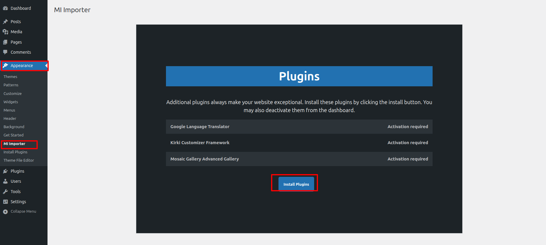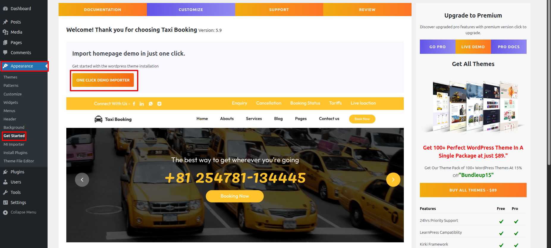 Once you are on the Get Started, click on the ONE CLICK DEMO IMPORTER button.