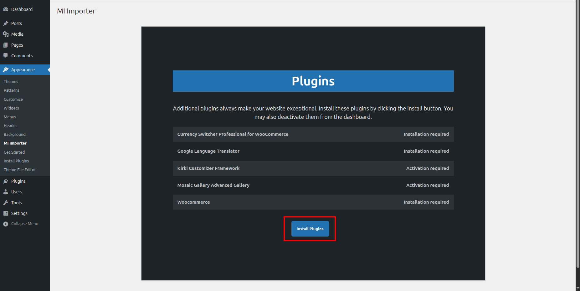 Once you are on the Get Started, click on the ONE CLICK DEMO IMPORTER button.